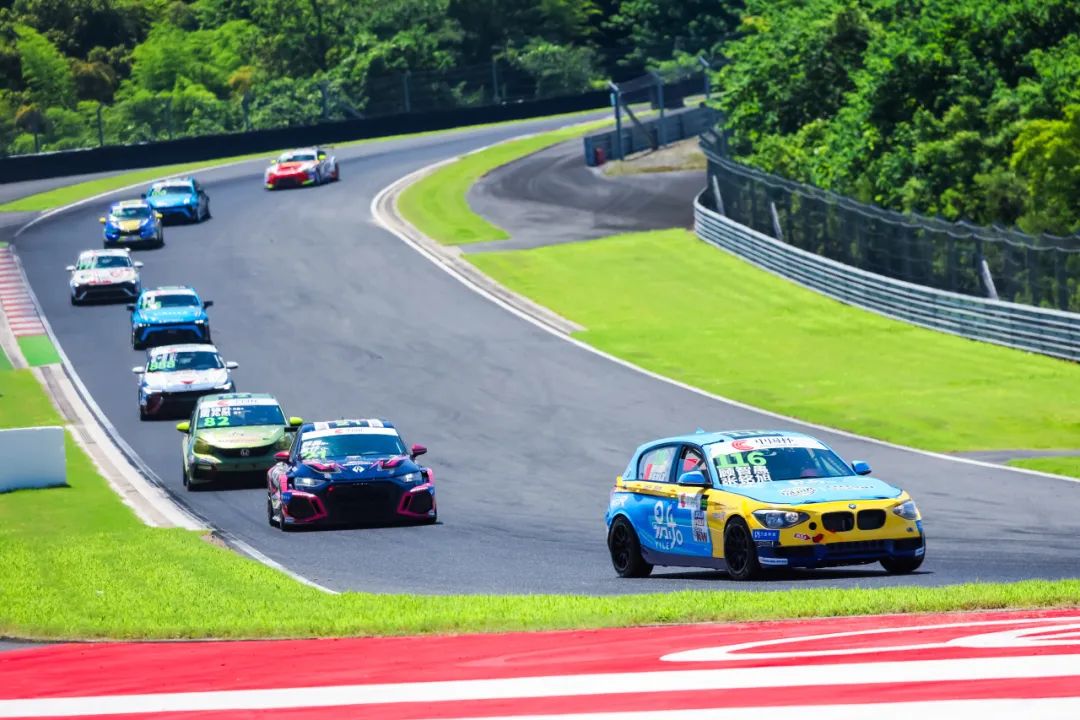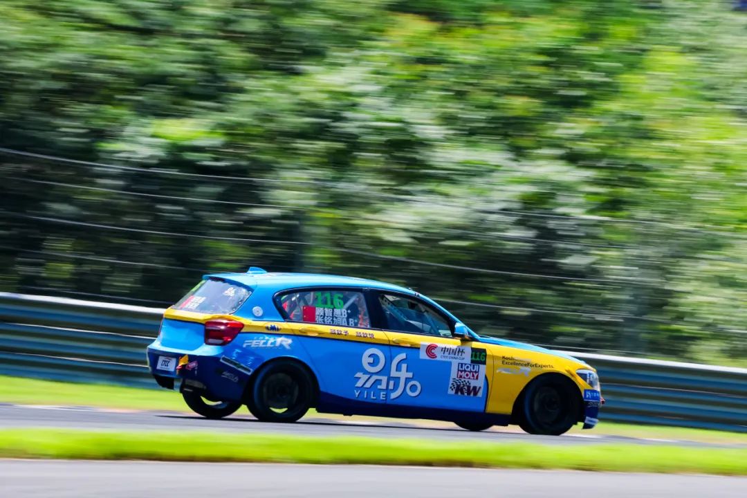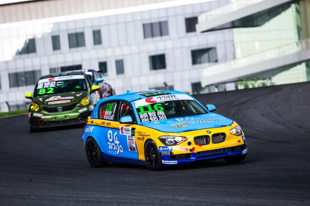 6 月 28 日周六,绍兴柯桥的天气给车手们带来了巨大的挑战。原本近30台中国杯赛车在高温下燃擎起步,由顾智愚/张铭旭驾驶的116号赛车起步相当顺利,赛车的表现也很稳定,中间车手更是尝试挑战前面的竞争对手。