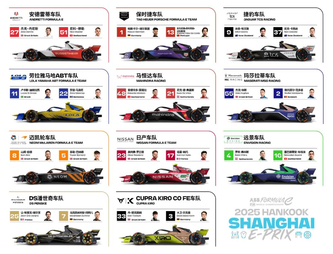 来自世界顶级汽车品牌如迈凯伦、玛莎拉蒂、捷豹、日产和保时捷等11支车队、22名车手将在上海国际赛车场展开激烈角逐。车手将驾驶GEN3 Evo赛车驰骋赛道,这是目前电动方程式中最快、最轻,动力最强大、最高效的赛车型号,零百加速仅需1.86秒。