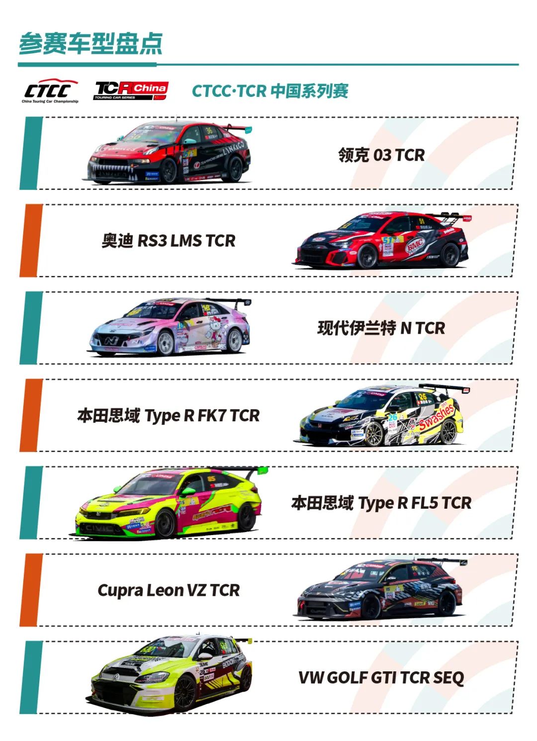赛车方面,TCR中国系列赛汇聚了领克03 TCR、奥迪 RS3 LMS TCR、现代伊兰特N TCR、本田思域TYPR TCR、Cupra Leon VZ TCR、大众高尔夫GTI TCR等知名TCR战车。