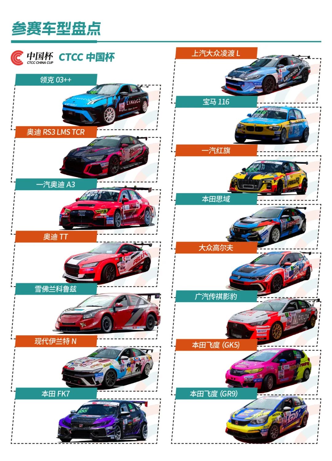 CTCC中国杯是展现中国本土赛车力量的舞台。参赛车型中既有厂商自主研发的领克03++、上汽大众凌渡L等国产赛车,也有俱乐部运营的TCR赛车,还有本土车队打造的一汽红旗、奥迪TT、宝马116、本田飞度等焦点车型,全面展现了中国自主赛车产业的风采。