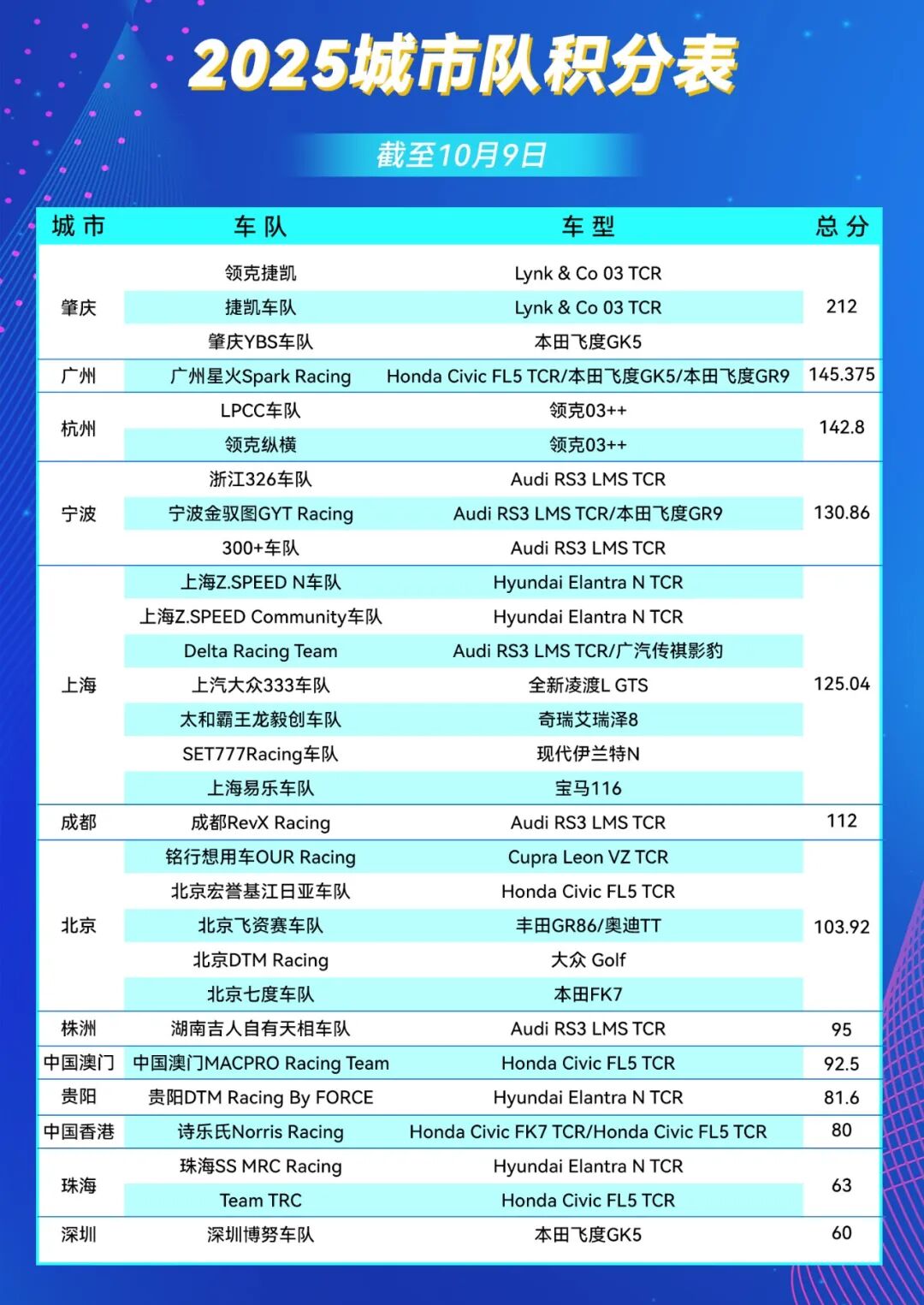 目前,杭州在CTCC城市战队积分榜中位居第三,宁波与上海紧随其后,江浙沪战队在区域竞争中展现出非凡实力。