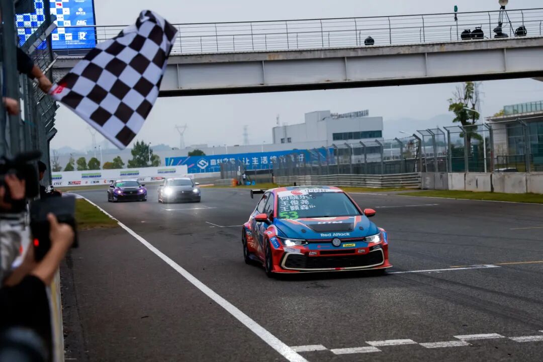 何晓乐接过这台大众高尔夫8赛车后并未急于追赶,而是凭借自己的经验分析了战局,选择适时地保护好车辆与轮胎,直至最后关头再进行最终尝试。好在幸运女神眷顾了这支车组,竞争对手相继遭遇状况和故障使得53号车组在距离比赛结束仅剩最后1分钟时来到了TC1组领先的位置。