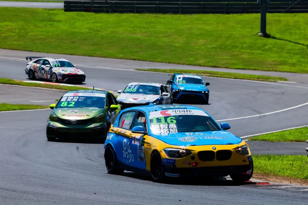 6 月 28 日周六,绍兴柯桥的天气给车手们带来了巨大的挑战。原本近30台中国杯赛车在高温下燃擎起步,由顾智愚/张铭旭驾驶的116号赛车起步相当顺利,赛车的表现也很稳定,中间车手更是尝试挑战前面的竞争对手。